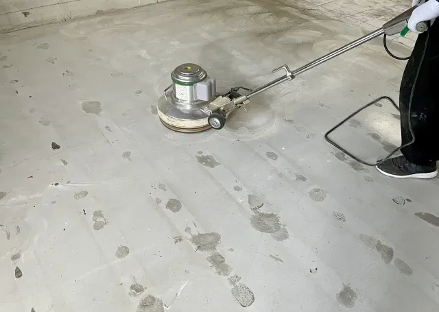ポリッシャーに適切なブラシやパッドを取り付け、粉汚れが付着している箇所を軽く研磨します。この工程で、表面に固着した粉汚れを浮かせたり、ある程度剥離させたりすることができます。特に、凹凸のある外壁材や、目地などに堆積した汚れに対して有効です。